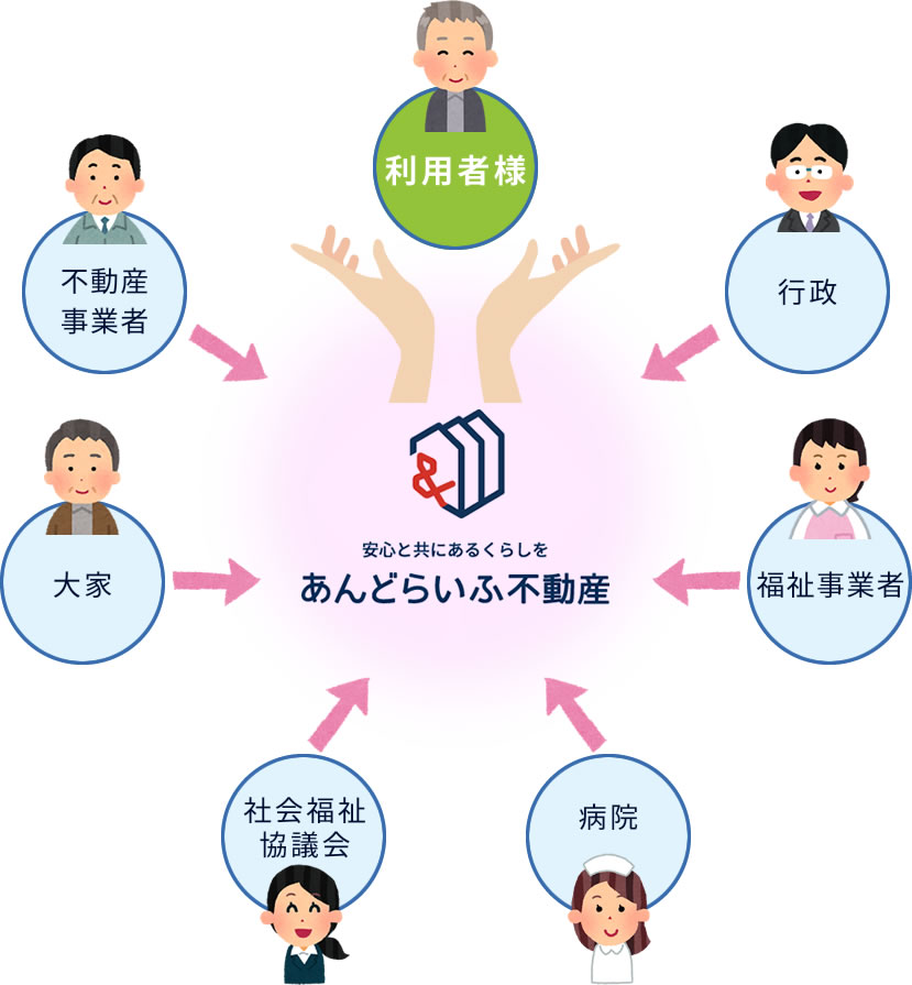 あんどらいふ不動産の会社名の由来ですが、あんど=「&」には「~と共に寄り添う」と「安堵する」という意味が、らいふ=「暮らし」や「生活」という意味がそれぞれ含まれており、高齢者の皆様に、生活の支援なども含めた「共に寄り添った」住まいを提供することで、「安堵」な「暮らし」を過ごして頂くという想いで「あんどらいふ不動産」という会社名にしました。